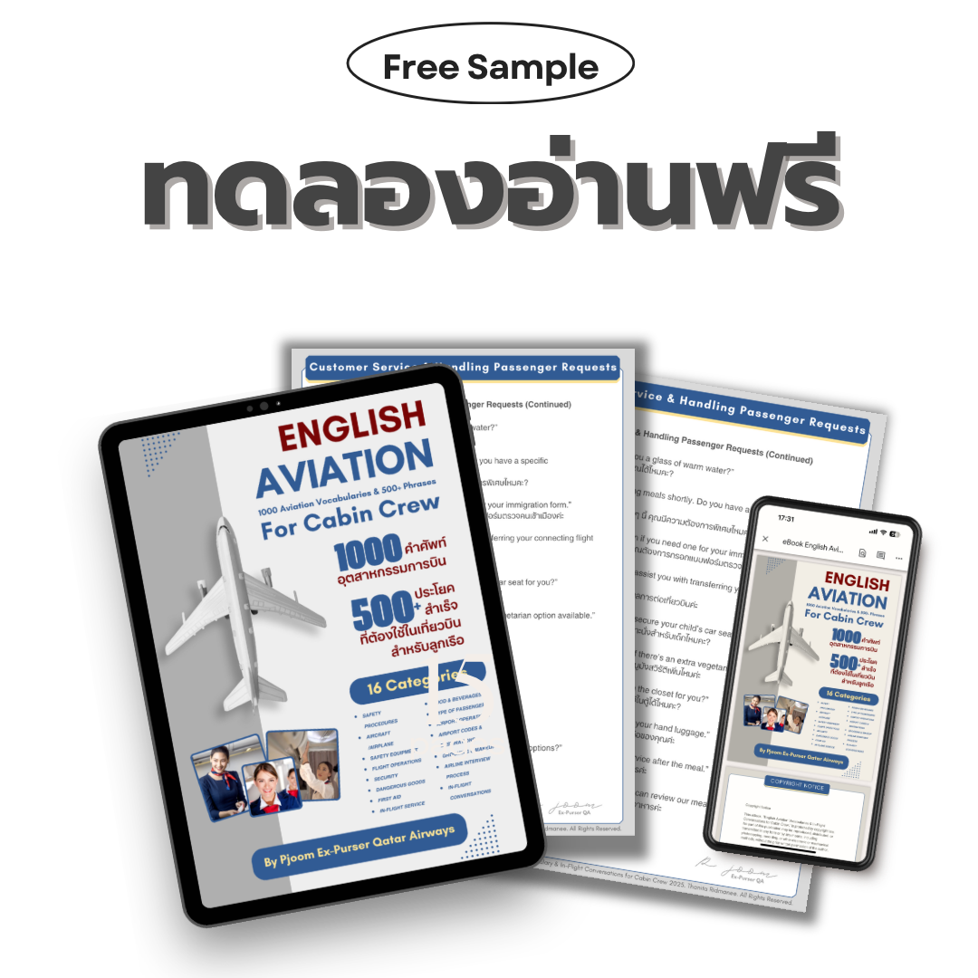 ในไฟล์นี้น้องจะได้เห็นรูปแบบคำศัพท์ ประโยคสนทนา และหัวข้อที่ใช้จริงในงานลูกเรือ ทั้งด้านบริการ ความปลอดภัย และภาษาเฉพาะในวงการการบิน