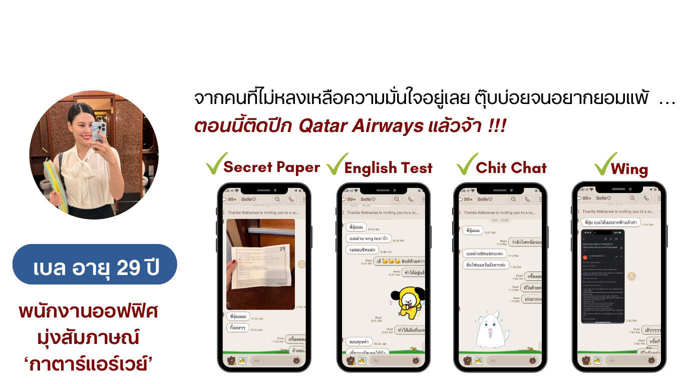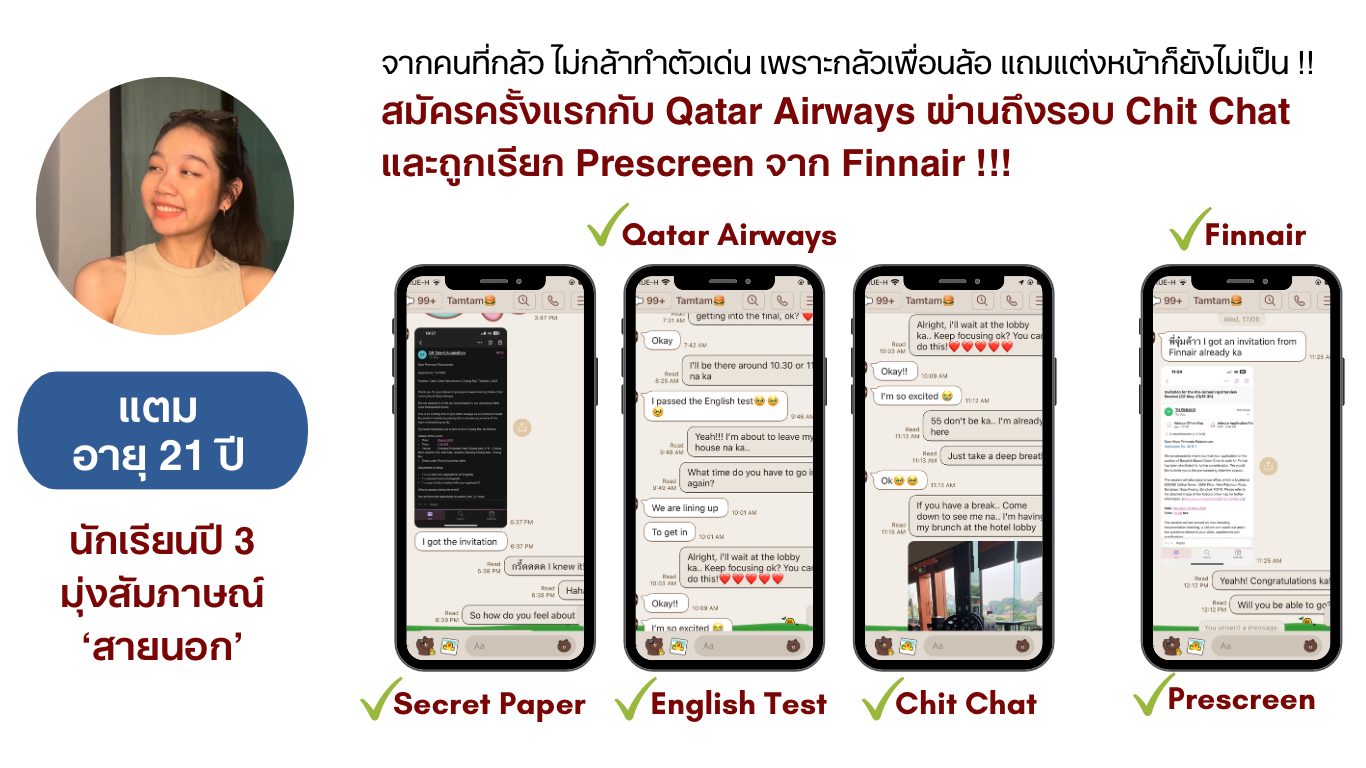 ได้ฟังพี่จุ๋มไลฟ์แค่3นาทีรู้สึกมีแรงบันดาลใจและอยากลองที่จะสมัครดู จึงได้ทักไลน์หาพี่จุ๋มเพื่อขอคำแนะนำ ซึ่งพี่จุ๋มพาทำ cv ตั้งแต่การเลือกรูป พาปรับกระทั่งตำแหน่งตัวหนังสือ บอกรายละเอียดการเขียน cv ทั้งหมด พอชใช้เวลาทำเกือบสองวัน พี่จุ๋มตรวจและตีกลับให้แก้ น่าจะเกือบ 20 ครั้งได้ ซึ่งตัวพอชเอง ประทำใจ ความใส่ใจทุกดีเทลของพี่จุ๋มมากและในที่สุดก็ได้รับ invited จาก Qatar มาจริงๆ